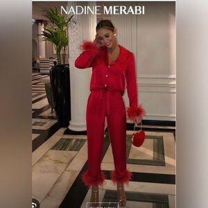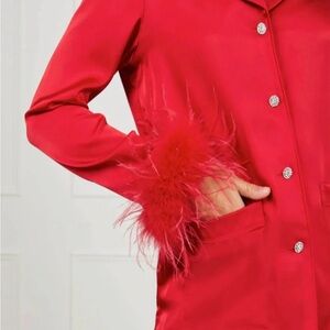 Luxurious red set with elegant feather trim. Perfect for a cozy night in.