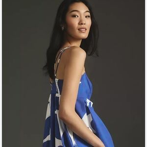 ANTHROPOLOGIE Dress MED Printed Babydoll Smock Maxi Blue White Abstract Strappy