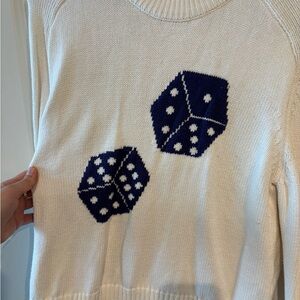 Chic cream sweater with bold navy dice pattern. Ideal for casual wear.