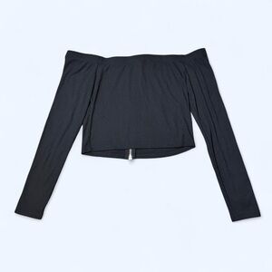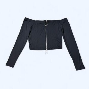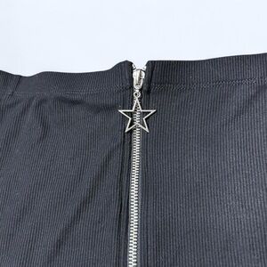 has 2 silver star zipper pulls, ribbed fabric, an off the shoulder neckline, and stretchy material!