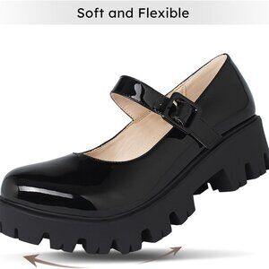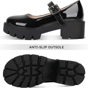 Features: These chunky mary janes pair a shiny patent leather finish with a sturdy rubber sole and a convenient buckle strap for easy wear. The low 2-inch heel adds a trendy touch while keeping you comfortable all day.