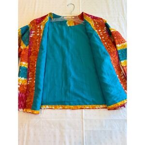 Choices open front quilted jacket features a vibrant multicolor striped pattern with a textured, stitched finish. Crafted with a 100% cotton shell and filling, it offers a lightweight yet structured feel, complemented by a smooth teal polyester lining. The collarless design and three-quarter length sleeves create a modern, relaxed silhouette perfect for layering.