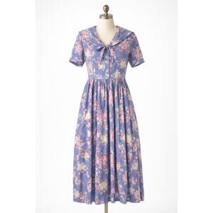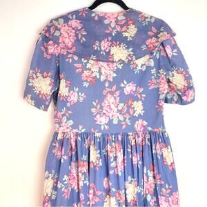 Vintage Laura Ashley Blue Floral Button-Up Dress Tie Collar Cottagecore Praire