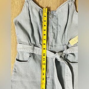 Features thick adjustable straps, a silver front zipper, and a matching belt to accentuate the waist. Made with stretch denim for comfort and a flattering fit. Perfect for brunch, casual outings, or daytime events.