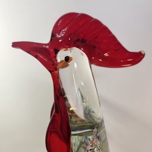 Elegant Murano glass rooster. Vibrant red comb and blue speckles. Clear glass body with artistic design.