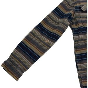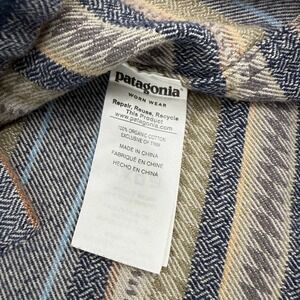 Patagonia long-sleeve button-down shirt crafted from soft organic cotton with a unique horizontal striped pattern. This mid-weight flannel features a classic collar, two button-flap chest pockets, and adjustable button cuffs. The earth-toned palette includes shades of blue, olive, and tan, accented by a subtle chevron texture within the knit. Please note there is a small bleach spot on the right sleeve as shown in the photos.