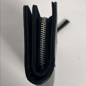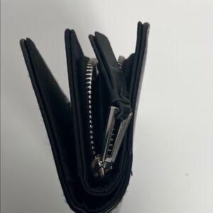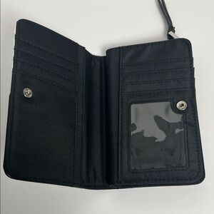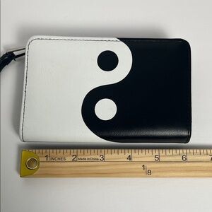 Stylish wallet with a yin yang design. Features black and white colors. Compact and chic.