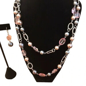 Whether draped in a single strand or doubled for a layered look, this necklace is a versatile statement piece. The coordinating earrings complete the ensemble, making it an ideal choice for both special occasions and everyday elegance.