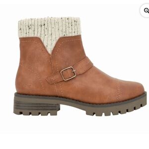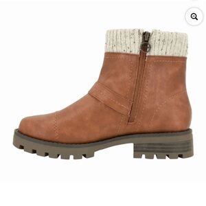 Chic tan ankle boots with a knit cuff. Ideal for everyday wear.