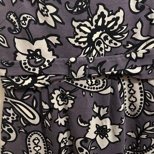 Boden Roma Paisley Floral Print Ponte Dress with cap sleeve and hidden side zipper. A knotted waist detail. Size: 8R Color: Smokey Purple, Gray, Black & Cream Fabric: 86% Cotton, 14% Polyamide Style: WH213 Condition: Good preowned Measurements approximate while lying flat Pit to pit: 17.5" Shoulder to hem: 35" Waist: 15"