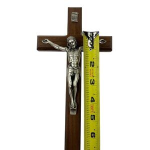 Mcvan Walnut Wood Wall Crucifix Cross 10" Beveled Edges Silvertone Corpus USA