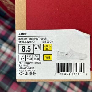 Sleek white slip-on shoes by Vans. Perfect for casual wear. Comfortable and stylish. Slightly discolored on the left shoe.
