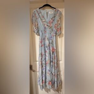 Charming maxi dress with pastel floral patterns. Features a flowing silhouette and delicate ruffle details. Ideal for elegant outings.