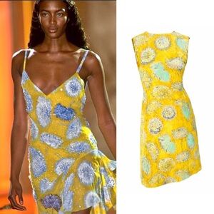 Vintage GIANNI VERSACE S/S 1997 Velvet Dandelion Silk Shift Dress in Yellow