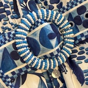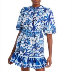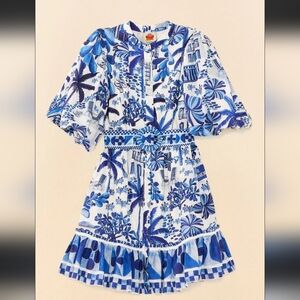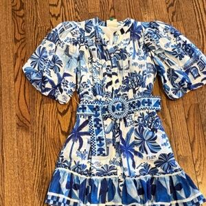 Farm Rio Sweet Rio Mini dress size Small Blue Womens Beaded Belt Puff Sleeve