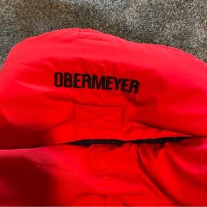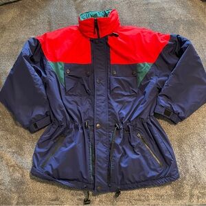 Stylish multicolor obermeyer VTG winter jacket with red, purple, and green panels. Features zippered pockets and adjustable waist. Rare piece