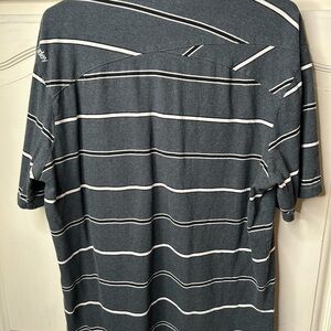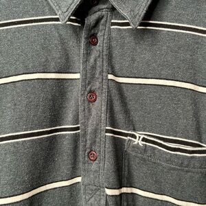 Classic Hurley polo with blue with black and white stripes. Features a chest pocket and button-up collar. Ideal for casual wear. Good preowned condition. From a smoke free home. No known stains, holes or flaws