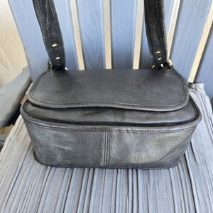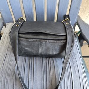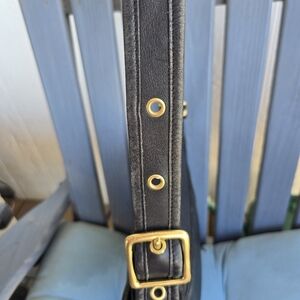 Vintage Legacy Patricia Coach Sleek black leather crossbody bag with adjustable strap and gold-tone hardware.