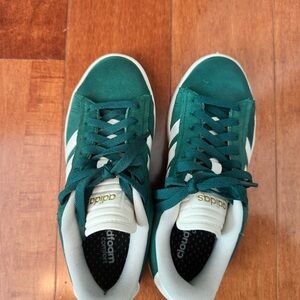 Stylish Adidas sneakers in forest green. Features white stripes and sole. Comfortable and trendy for daily wear.