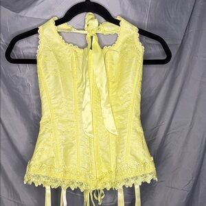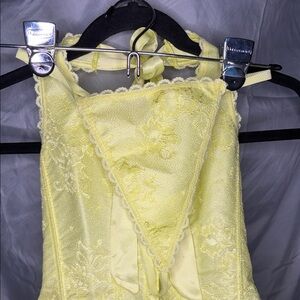 Chic yellow lace camisole with halter neck. Delicate lace details. Perfect for layering or wearing alone.
