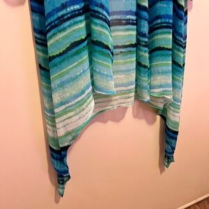 Ruby Rd kimono cardigan XL, sheer long cardigan, flowy kimono, lagenlook style, boho chic, artsy layering, ocean blue green stripes, festival top, lightweight coverup, oversized kimono, layered look, artistic fashion, relaxed fit, summer cardigan, breezy kimono, creative wardrobe, casual bohemian, long open front, statement cardigan, lightweight polyester, resortwear, tropical, beachy, poolside, coverup, swim cover