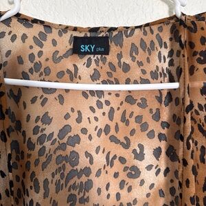 Sky Plus sheer long kimono robe with leopard print. Lightweight and flowy fabric, perfect for layering over outfits, swimwear, or lounge sets. Open front design with a relaxed fit. Great for beach, vacation, boho looks, or casual wear.