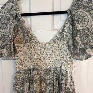 Elegant maxi dress with floral and geometric patterns. Features a V-neckline and flutter sleeves. Perfect for casual or semi-formal occasions.