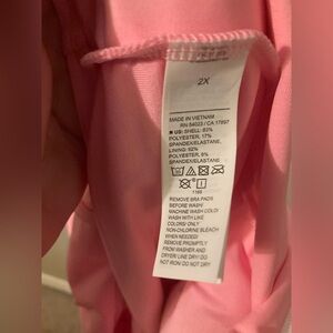 This one is: a 1 piece Old Navy swimsuit. Size 2x, it is pink with some white and features a lovely front zip design. Does not zip all the way down though, it’s more for looks. I’m assuming this is adult sizing (AI said kids but kids and juniors aren’t usually shown as 2x).