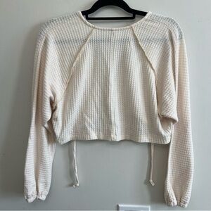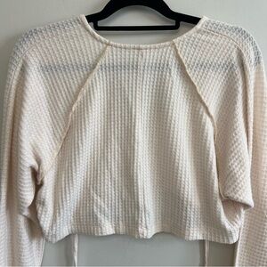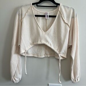 Stylish cream crop top with a V-neck design. Features a cozy waffle knit texture. Ideal for casual wear.