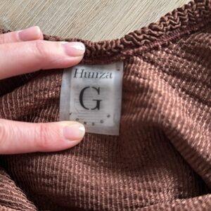 Hunza G one piece one size Brown Domino Swim with tortoise hoops. Classic bottom, medium bust support. Brand new without tags, never worn, didn't fit my other bust size.