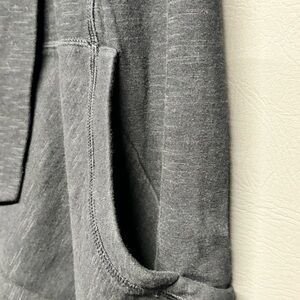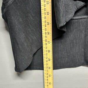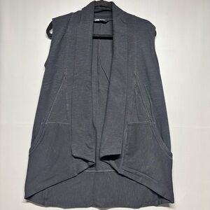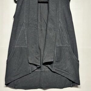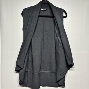 Classic black color with an open front draped design that flatters the silhouette. Lightweight and comfortable fabric, perfect for layering during fall or spring. Features functional front pockets.