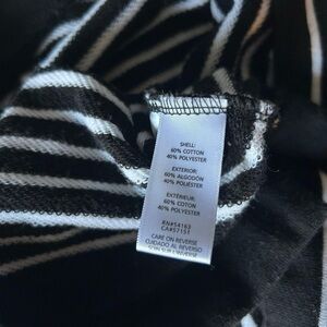 Chic and cozy! This Karl Lagerfeld striped hoodie features bold black & white stripes, cropped sleeves, and the designer’s iconic sunglasses embroidered on the front.