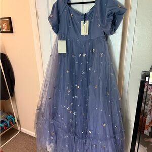 Charming tulle gown with shimmering star details. Ideal for evening events. Size 1x but very stretchy in the top. Light purple with silver stars.