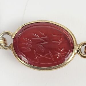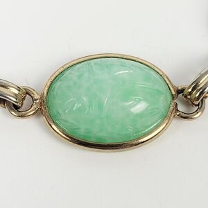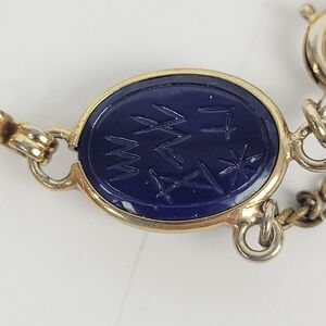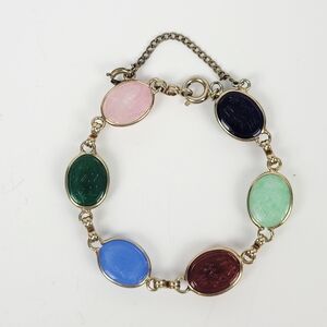 Vintage Egyptian Revival Silver Tone Glass Cabochon Scarabs Bracelet w/Safety Chain. Please see photos to better understand the condition. You will notice light wear associated with normal use and handling. The bracelet measures about 7" long.