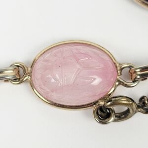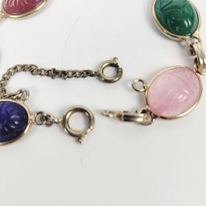 Vtg Egyptian Revival Silver Tone Glass Cabochon Scarabs Bracelet w/Safety Chain