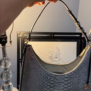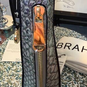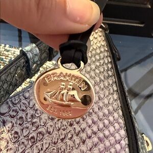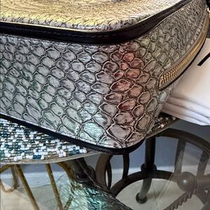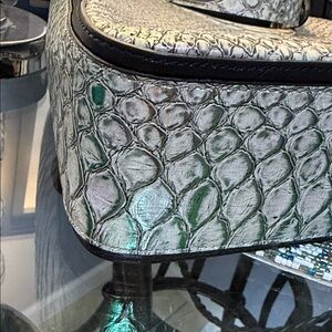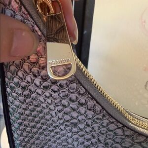NWOT. I bought this bag because I loved the color and took the tags off. However, I never used it. It has been in the closet for a while in the dustbag. Still has the plastic on all the zippers. It is like a shiny silver/purple color.