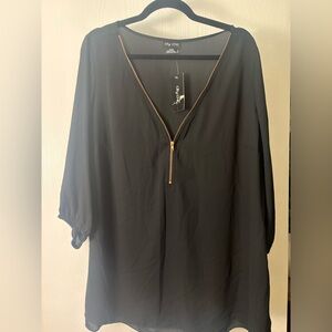 Chic black blouse by City Chic. Features a stylish coppery/rose-gold zipper. Perfect for versatile styling. Has a working zip V-neckline, relaxed fit style and 3/4 length sleeves. Currently, on sale for $32.99 at CC online.