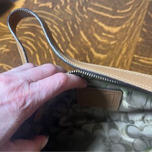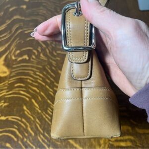Elegant Coach tan leather bag with sleek design. Perfect for daily use. Features a comfortable shoulder strap.