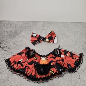 Labubu Halloween theme costume with a hair bow. Features an orange and black outfit. (Doll NOT Included)
