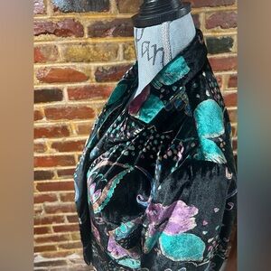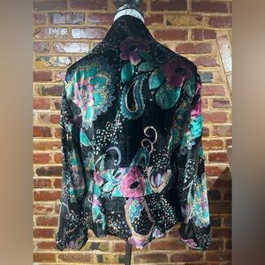 Elegant velvet jacket with floral design. Features shades of black, green, and purple.