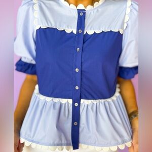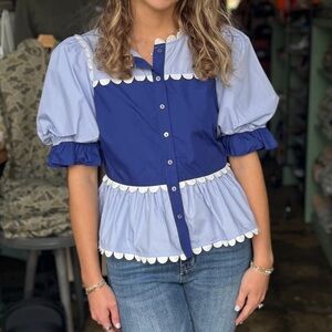 NWOT. Chic and stylish women's top featuring a beautiful blue and light blue color block combination. Perfect for any occasion. Scallop details throughout.