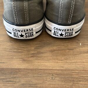 A pair of classic converse all star lows in grey with light grey laces. Green undertones. Excellent condition. Minor wear on insole and sole. Women’s 7 men’s 5