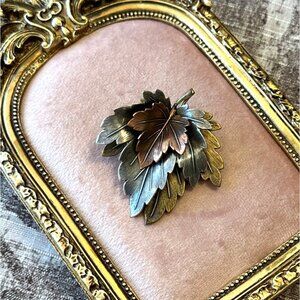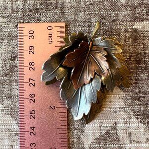 This vintage brooch is a charming piece of jewelry featuring a layered 3-D leaf design in gold, silver and copper tones. Its textured finish enhances its naturalistic appeal, making it a timeless accessory. The sturdy clasp ensures secure wear, blending functionality with elegance.