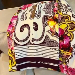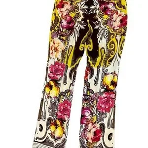 These Etro pants showcase a vibrant blend of yellow and pink hues in a straight leg silhouette, adorned with a striking floral pattern. The luxurious design combines vintage baroque elements with contemporary flair, creating a captivating and artistic piece. Perfect for making a bold fashion statement, these pants are both dramatic and romantic.
