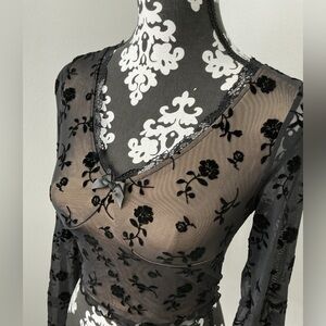 Discover elegance with this chic black sheer blouse, adorned with a beautiful floral pattern. Ideal for any stylish occasion.