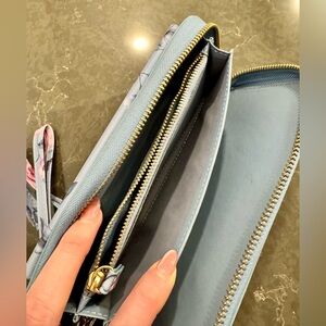 Adorable floral wallet‑crossbody hybrid in a soft light‑blue shade with pink rose detailing and gold hardware ✨