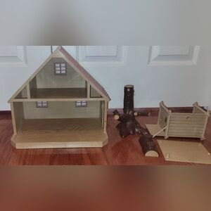 Lot includes: 1 House structure, 1 tree house structure (roof removable- has blemish, see photo), 1 bench and 1 tree.