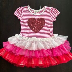 Charming striped dress with a sequined heart. Features layered pink and red tulle skirt. Perfect for casual outings.