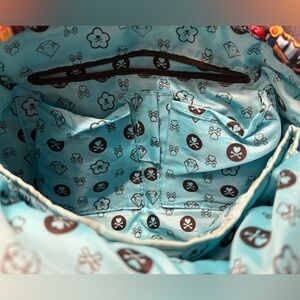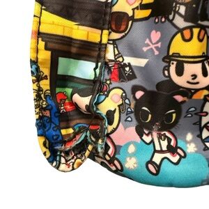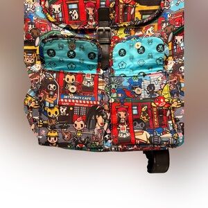 Authentic Tokidoki backpack featuring the highly sought-after city scene character print. Bright, vibrant graphics with multiple exterior snap pockets and spacious interior compartments. Lightweight and comfortable with adjustable straps.
