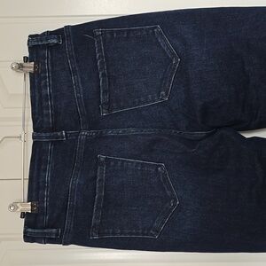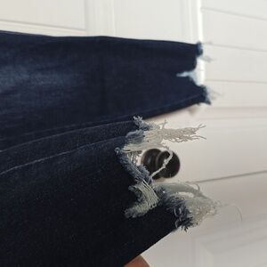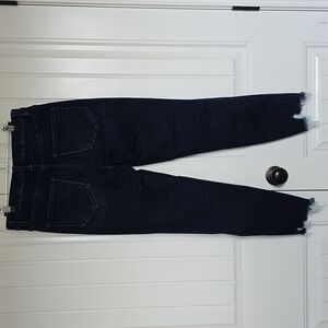 Stylish women's jeans featuring a dark blue color with a trendy frayed hem. Perfect for casual outings.